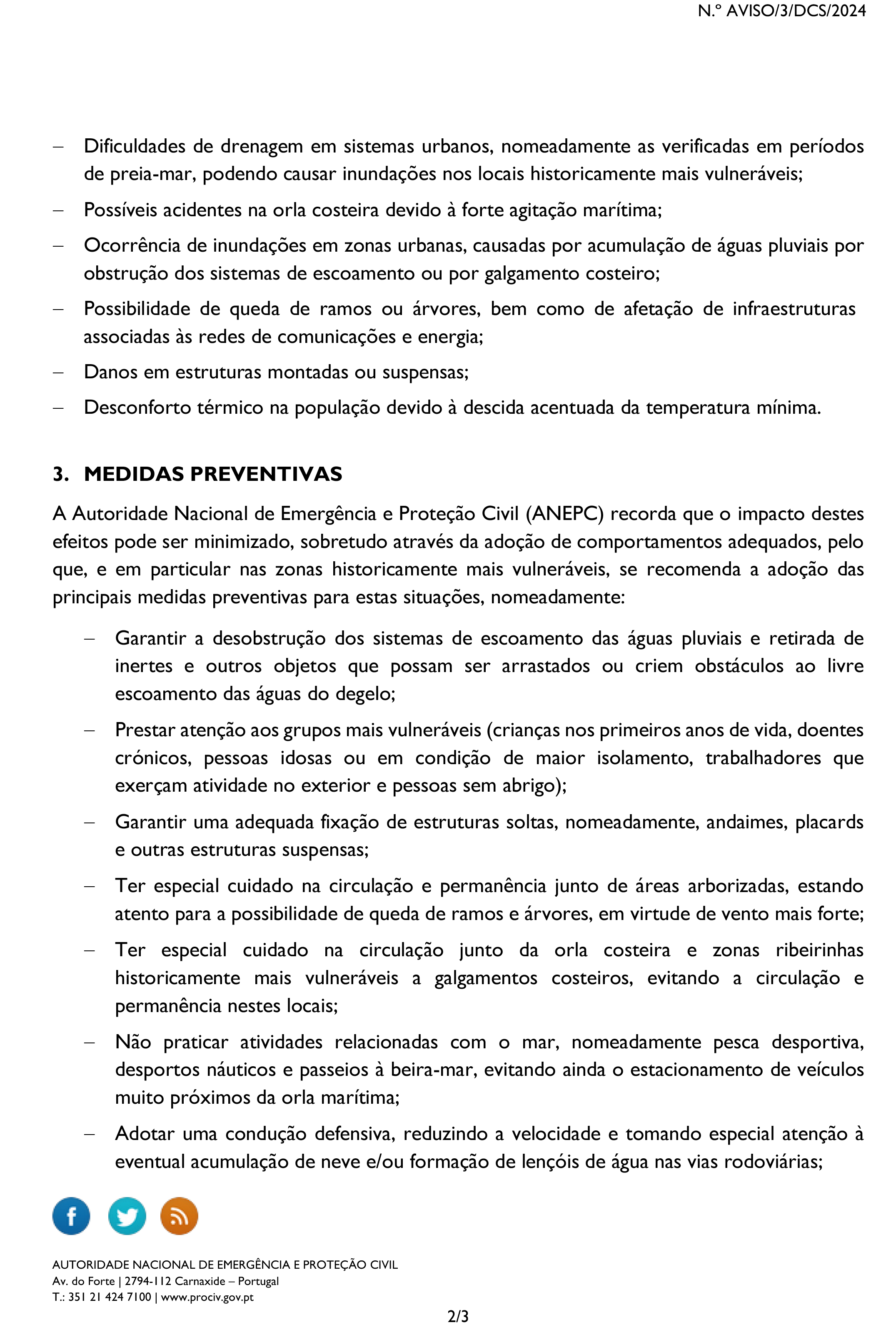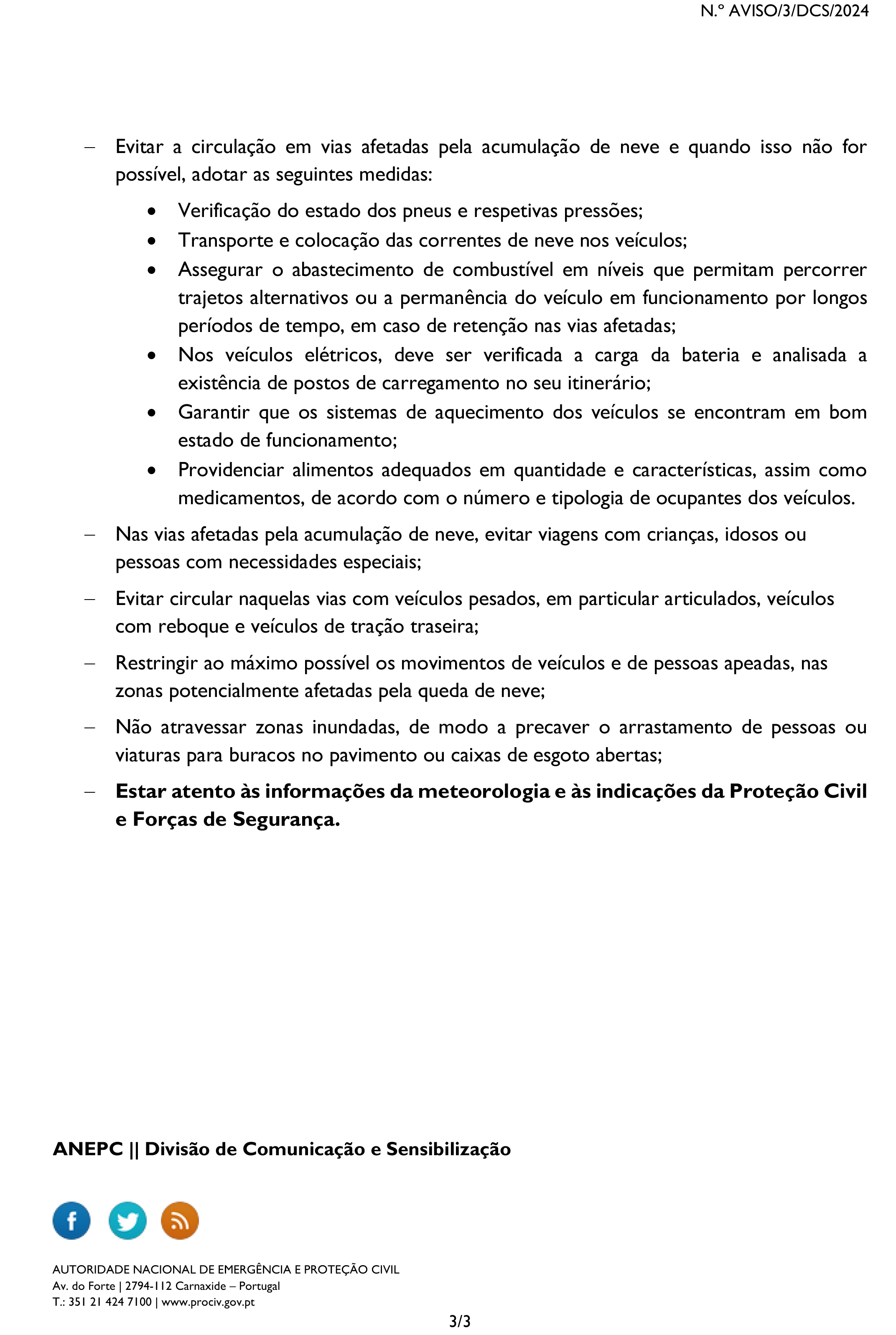 CHUVA, VENTO, AGITAÇÃO MARÍTIMA E QUEDA DE NEVE - MEDIDAS PREVENTIVAS