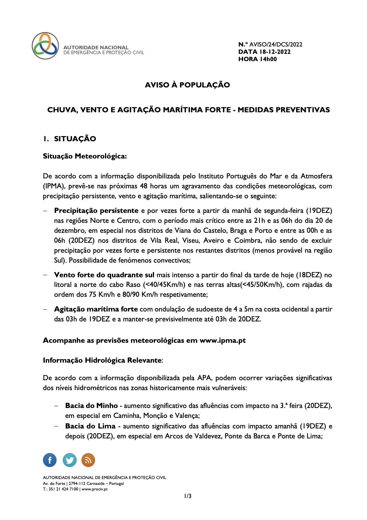 Aviso à População - Vento e Agitação Marítima Forte - Medidas Preventivas