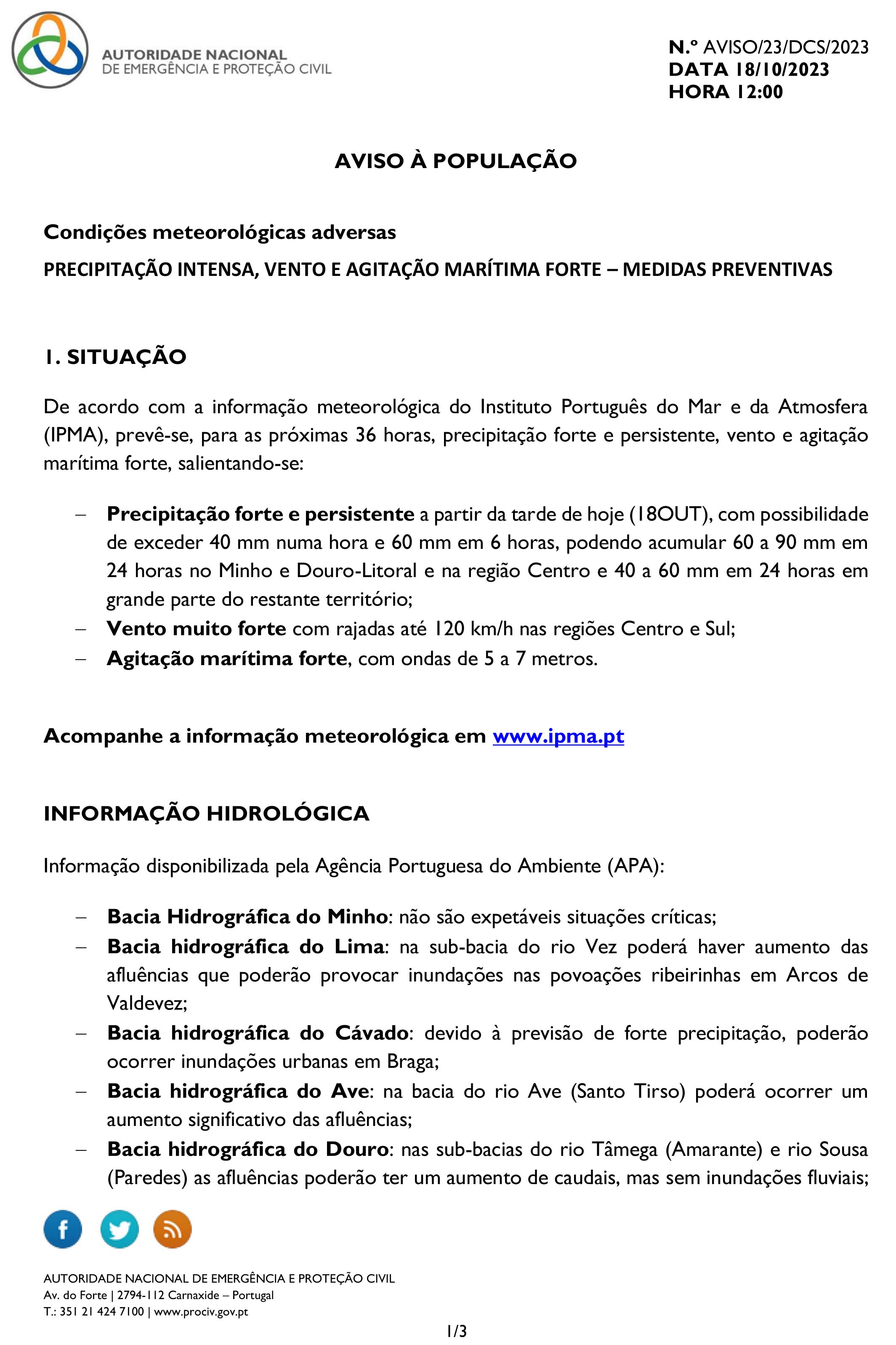 Aviso meteorológico emitido pelo IPMA - Distrito de Aveiro