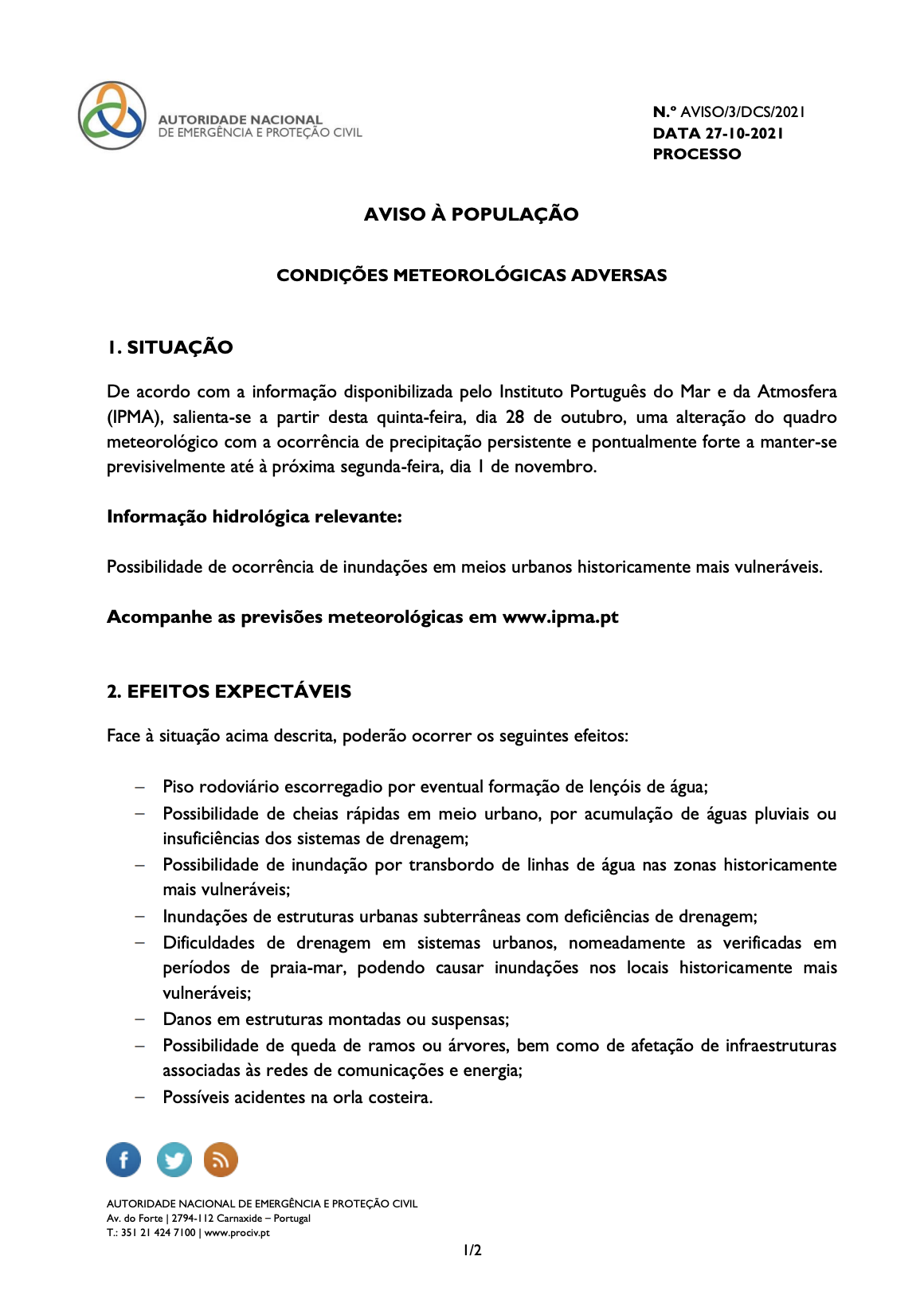 Aviso à População - Condições Meteorológicas Adversas - Medidas Preventivas