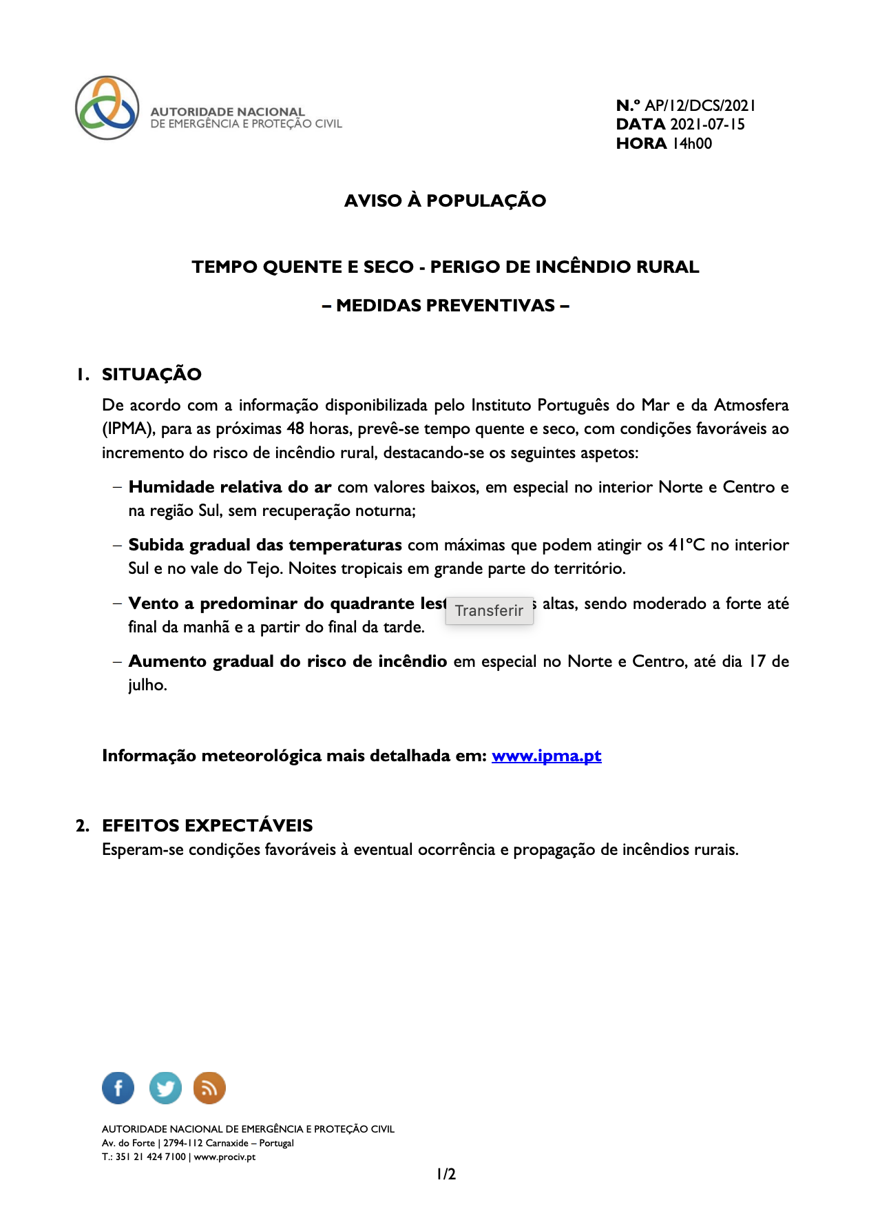 Aviso à População - Perigo de Incêndio Rural - Medidas Preventivas