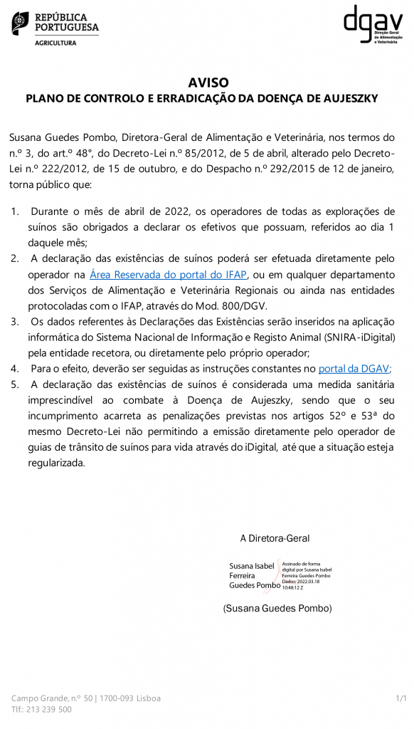 Aviso - período obrigatório de “Declaração de Existências de Suínos (DES)