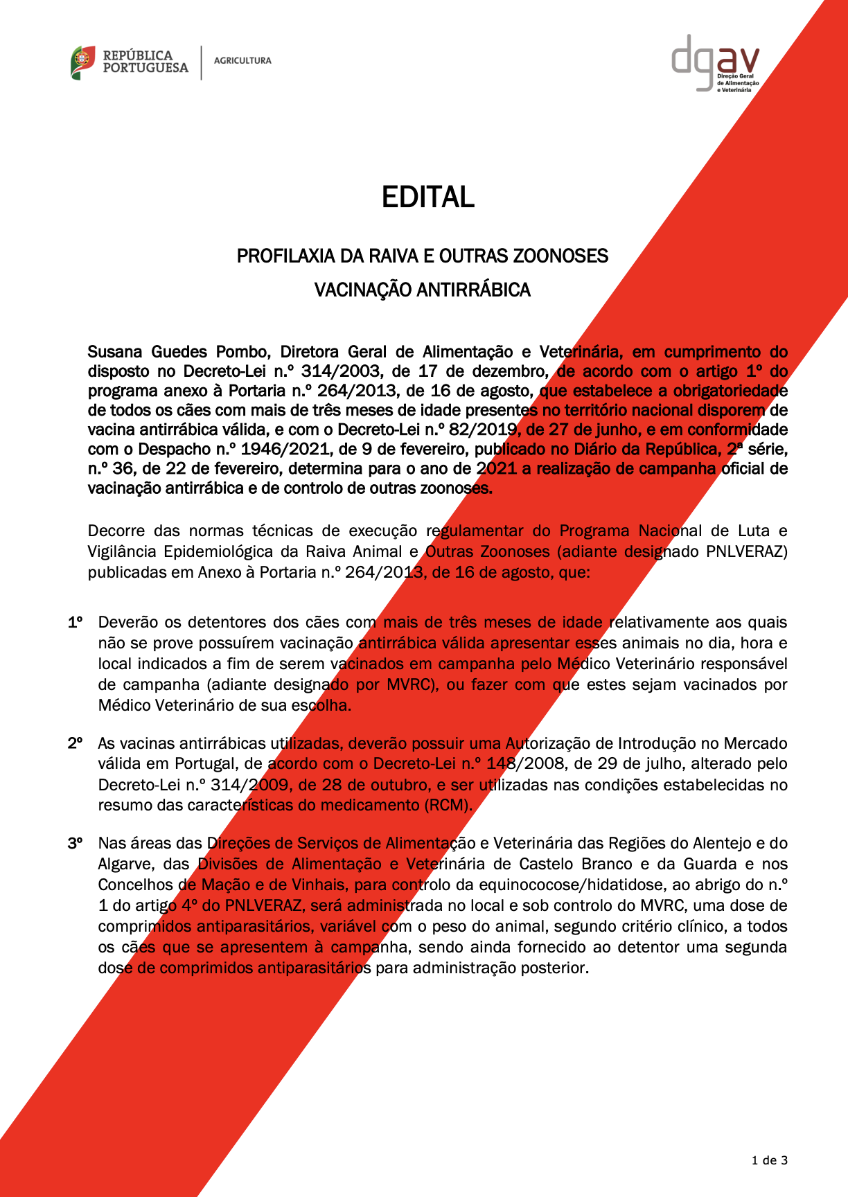Edital - Campanha de Vacinação Antirrábica e Identificação Eletrónica 2021