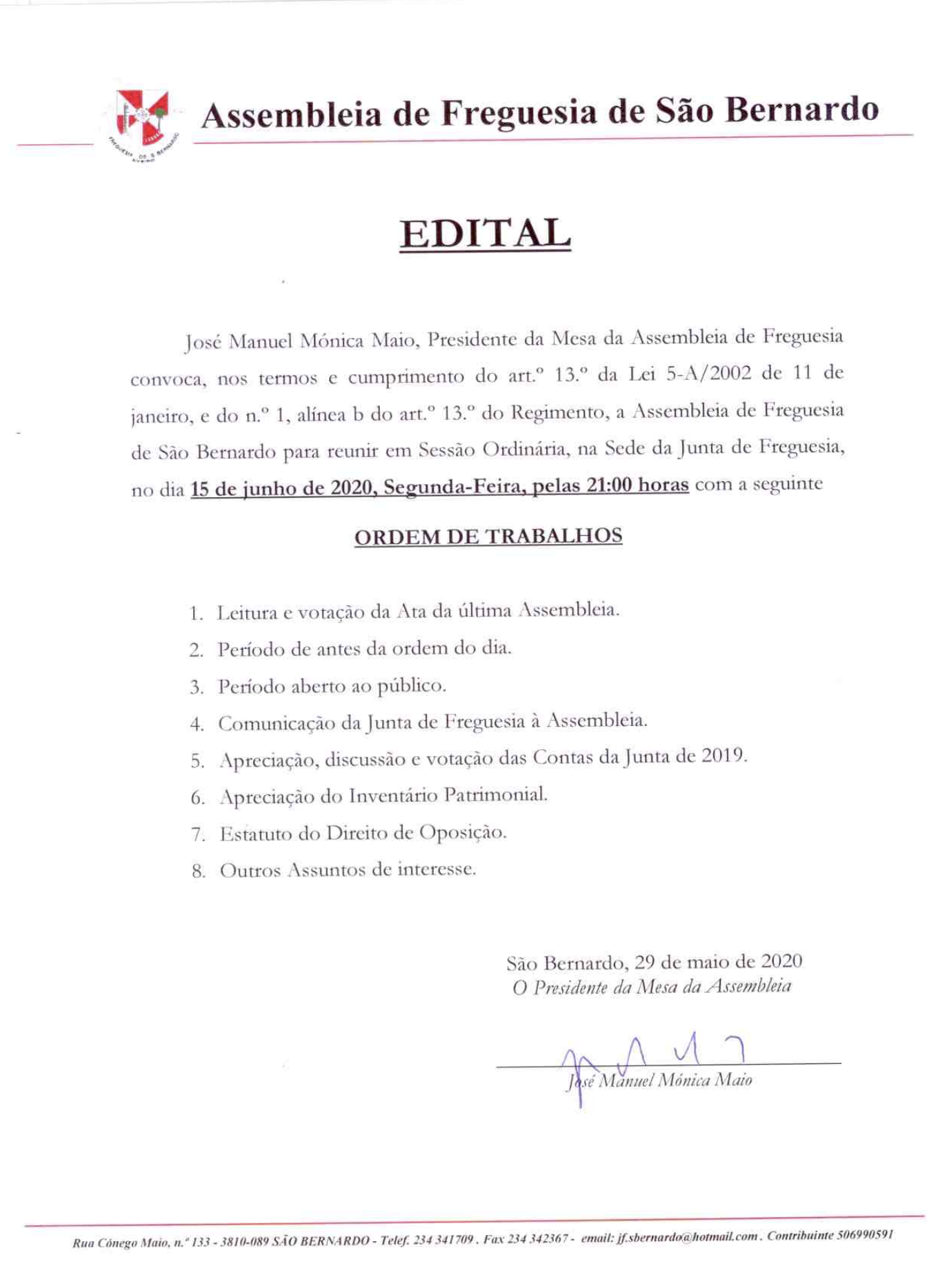 Edital - Sessão Ordinária da Assembleia de Freguesia
