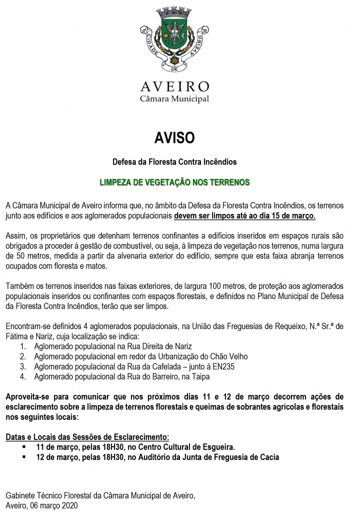 Aviso - Defesa da floresta contra incêndios e obrigatoriedade de limpeza de...