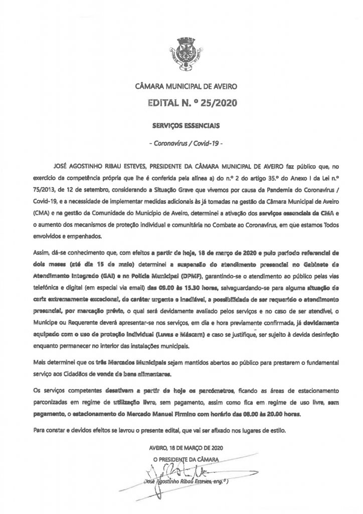 Edital n.º 25/2020 - Serviços Essenciais – Coronavírus/Covid - 19